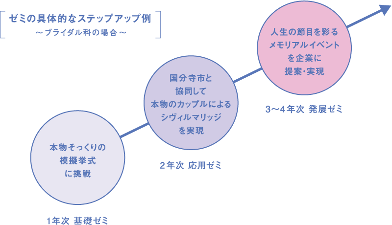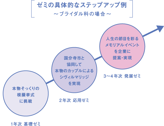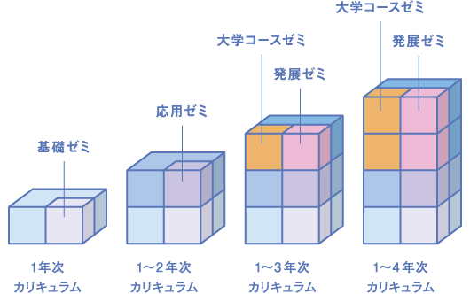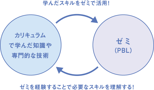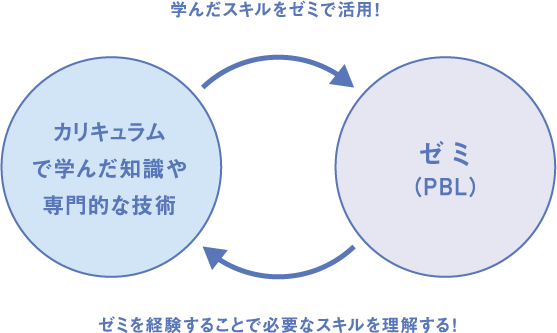 学科の様々な科目で修得したスキルを実際にゼミで活用することで「その知識や技術の必要性」や「自らに足りないスキル」などが見えてきます。このサイクルを繰り返すことで、大きな成⻑につなげていきます。